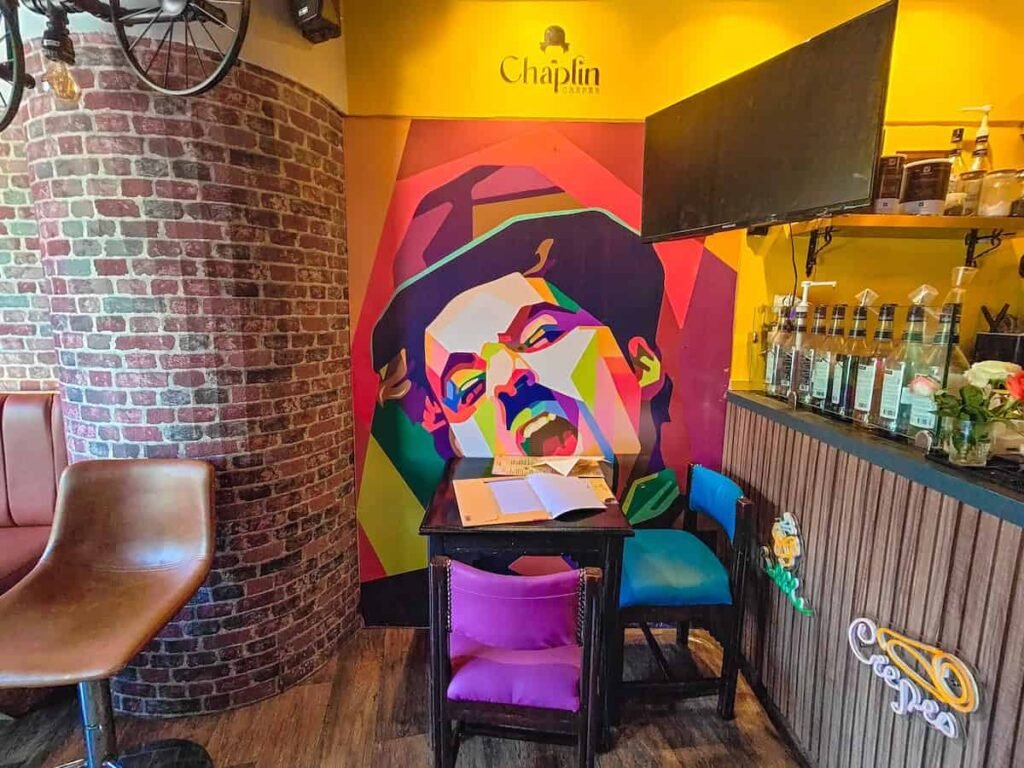 Heck, there’s even a vibrant street art-style mural featuring an iconic image of this legendary movie star. I chose to sit inside the small dining room, however, outdoor tables are available and overlook a nearby square.