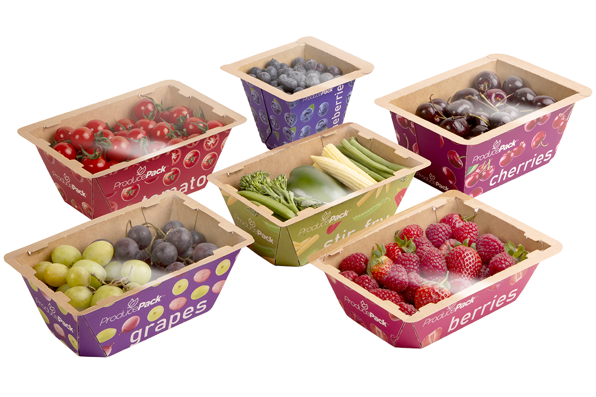 Une autre approche consiste à associer un fond en carton ou papier biodégradable avec un couvercle en R-PET. Cette solution concerne des barquettes de 125 g à 1 kg et combine rigidité, ventilation et protection mécanique. Le fond en matière naturelle assure une bonne résistance aux chocs et est compostable, tandis que le couvercle en R-PET garantit la transparence, la visibilité et la recyclabilité.