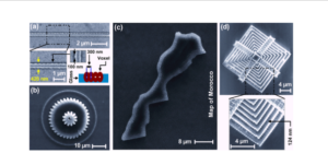 Figure 3. Scanning electron microscope (SEM) images of tiny 3D objects created using 2PP 3D-printing. (a) an extremely thin fiber only 420 nanometers wide, formed by carefully overlapping laser points. (b) A tiny 3D gear viewed from above. (c) A microscopic 3D map of the Kingdom of Morocco. (d) A microscopic pyramid built with astonishing precision; about 124 nanometers precision. For comparison, a single human hair is about 100 micrometers thick. (a-d) reproduced with permission from [3] under the Creative Commons CC BY license.