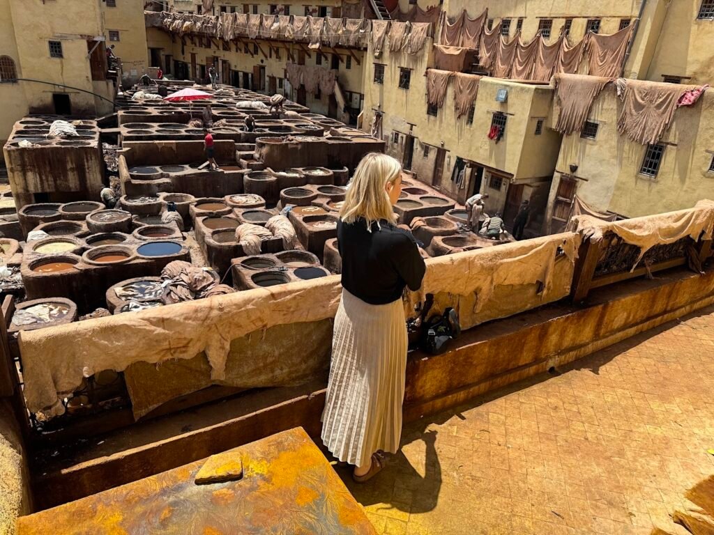 Often, a shop worker will greet you at the door, offer a sprig of mint to mask the intense smell, and explain the leather-making process. While there’s no obligation to purchase anything, you can still buy some simple leather wallets or shoes (I love the smell of the authentic leather in my purchased wallet there). You can view the colourful dye vats from the terrace viewpoints above the shops. If you’re brave enough, you can ask one of the workers below to take you down to the dyeing area for more dramatic, close-up photos — but be prepared to tip generously and tolerate the intense smell.