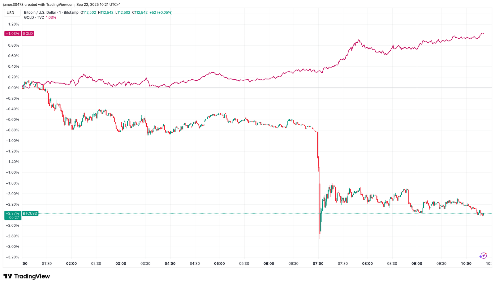The metal, now trading at $3,721, advanced about an hour after bitcoin , seen by some proponents as a digital form of sound money, posted a 24-hour drop of 3% that cut its price to $112,000 and its year-to-date gain to 17%. The timing suggests the possibility that profits from bitcoin liquidations rotated into gold.