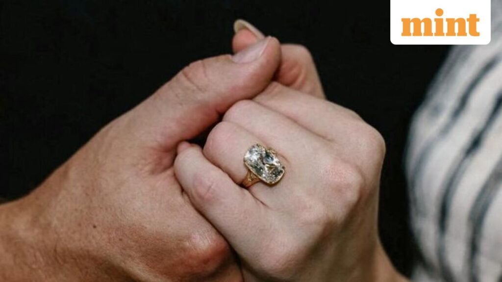 “Based on the limited photos we currently have, the centre diamond looks to be an elongated cushion cut of approximately five to six carats,” he said. “A diamond shaped like this could also be a ‘old mine’ brilliant cut, which is essentially an antique diamond, with a cushion shape. The setting looks yellow gold and is wider at the top, tapering down with engraving on the sides, possibly with a couple very small inlaid gemstones.