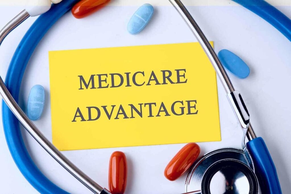 Medical and health concept. Phrase MEDICARE ADVANTAGE written on a yellow business card in a composition with a stethoscope and pills
