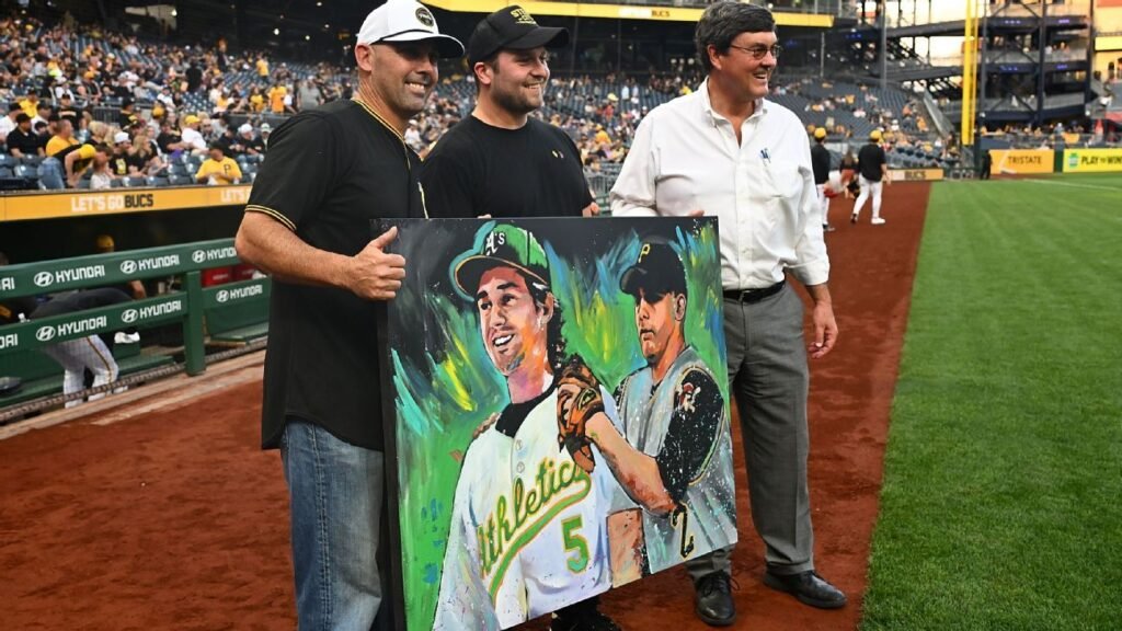 PITTSBURGH — Former Pirates shortstop Jack Wilson threw out the first pitch Friday to his son, Jacob, who plays the same position for the Athletics as they revisited a similar scene from 19 years ago.