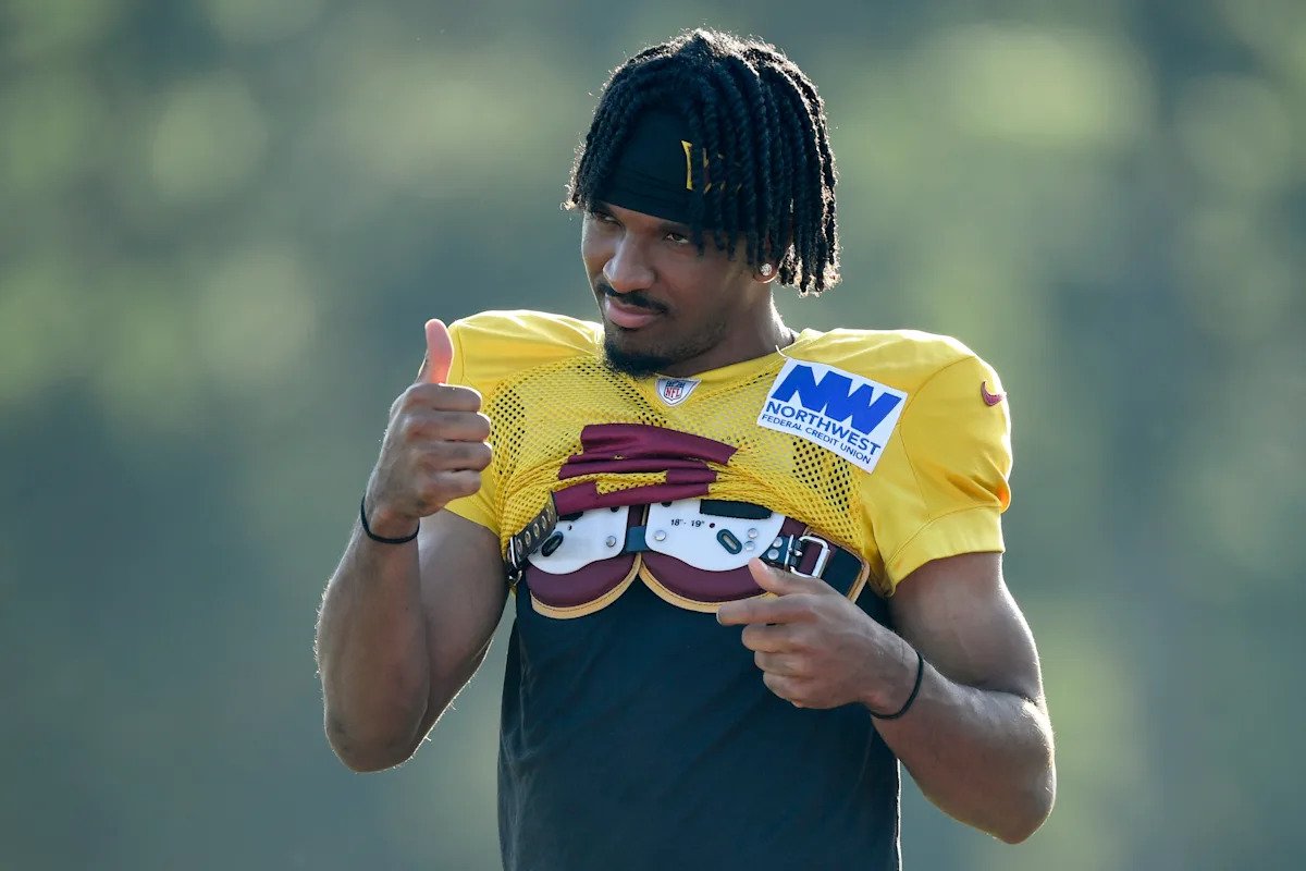 ASHBURN, VA – JULY 28: Washington Commanders quarterback Jayden Daniels (5) guestures to a fan during training camp on Monday, July 28, 2025. (Photo by Hannah Foslien/For The Washington Post via Getty Images)