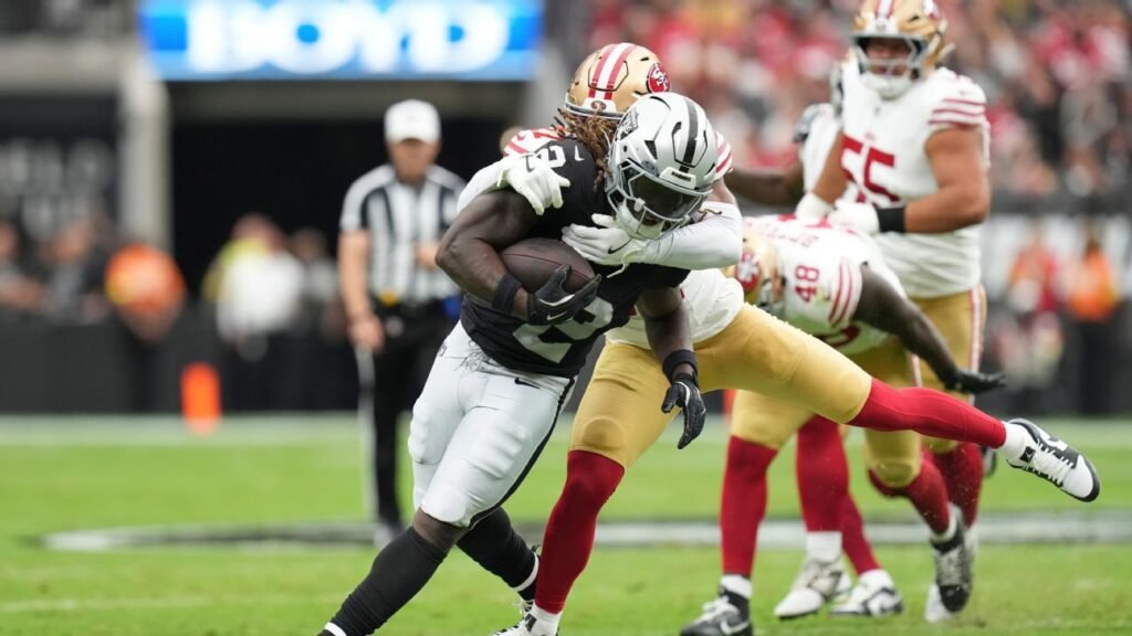 Lenoir, the San Francisco 49ers’ starting cornerback, tried single-handedly tackling the Las Vegas Raiders’ 5-foot-8, 208-pound rookie as he burst down the middle of the field. Instead, Jeanty pushed Lenoir down with his left hand and reached the 49ers’ 25-yard line before eventually being tackled by safety Ji’Ayir Brown on a 13-yard carry with 2:10 to go in the first quarter Saturday.