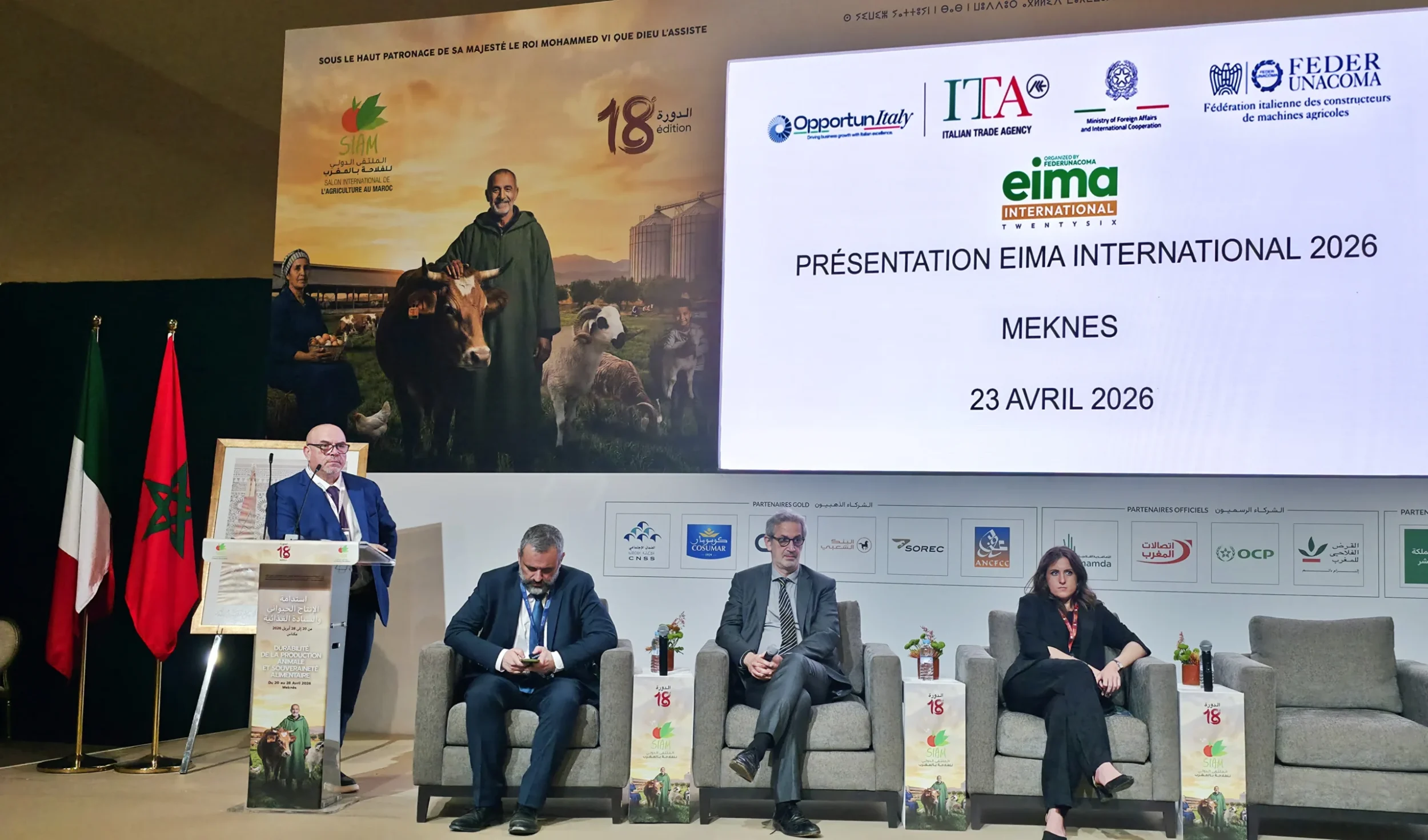 Rappelons que cette conférence s’inscrivait dans une participation italienne déjà bien visible au SIAM 2026. Porté par l’ICE, l’Ambassade d’Italie au Maroc et FederUnacoma, le pavillon italien installé au pôle international réunissait sur 150 m² une offre couvrant plusieurs maillons utiles aux filières marocaines, notamment la certification, l’emballage agroalimentaire, l’hydraulique, la transformation des viandes, le matériel végétal et le machinisme. Cette présence ne se limitait donc pas à une vitrine de matériels : elle traduisait une approche plus large, centrée sur des besoins concrets du marché marocain, depuis l’eau et la mécanisation jusqu’au conditionnement, à la transformation et à l’accompagnement technique.