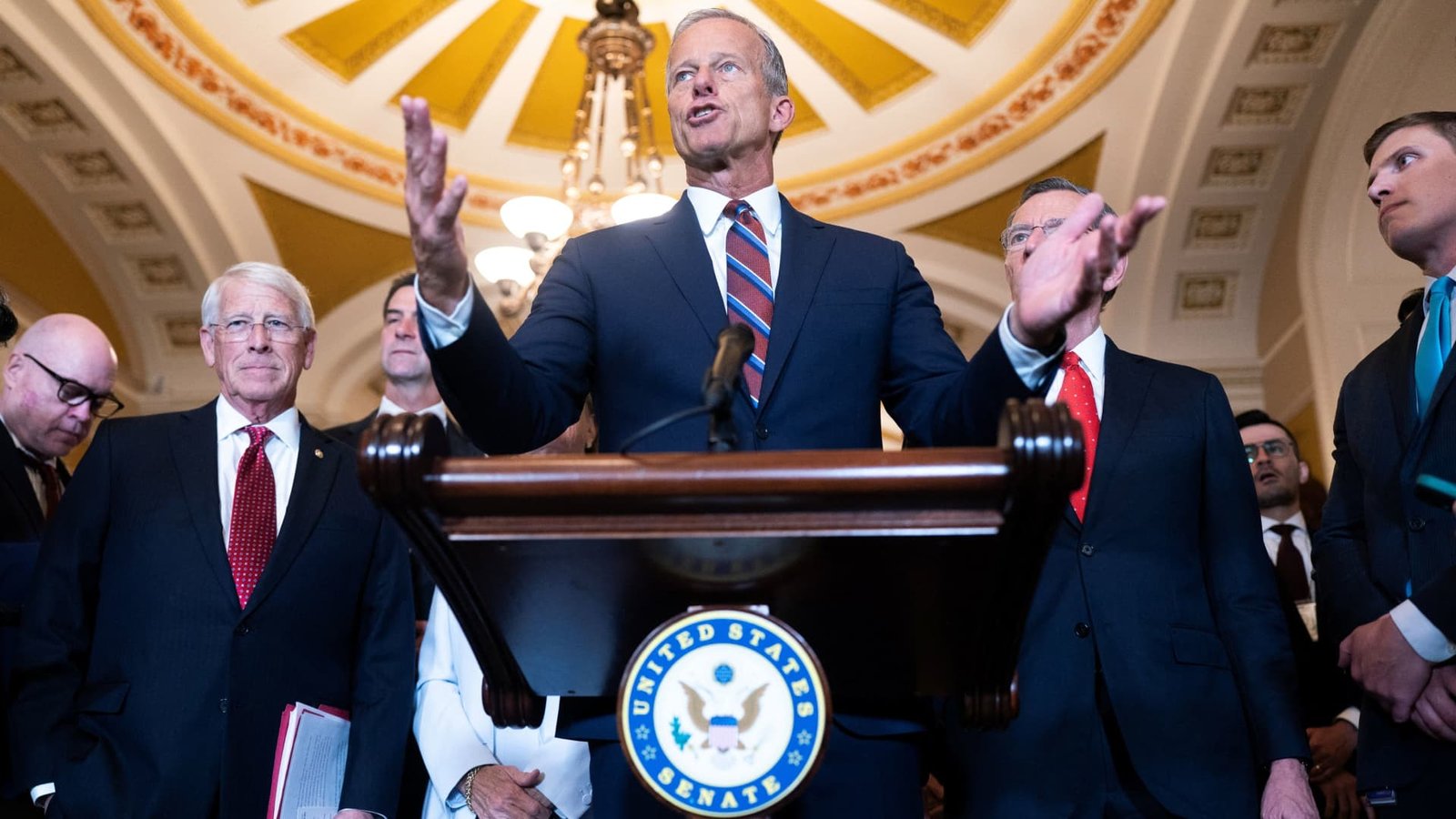 U.S. Senate Majority Leader John Thune (R-SD) speaks to members of the media alongside fellow Republicans during a press conference following Republicans weekly policy lunch on Capitol Hill in Washington, D.C., U.S., September 3, 2025.