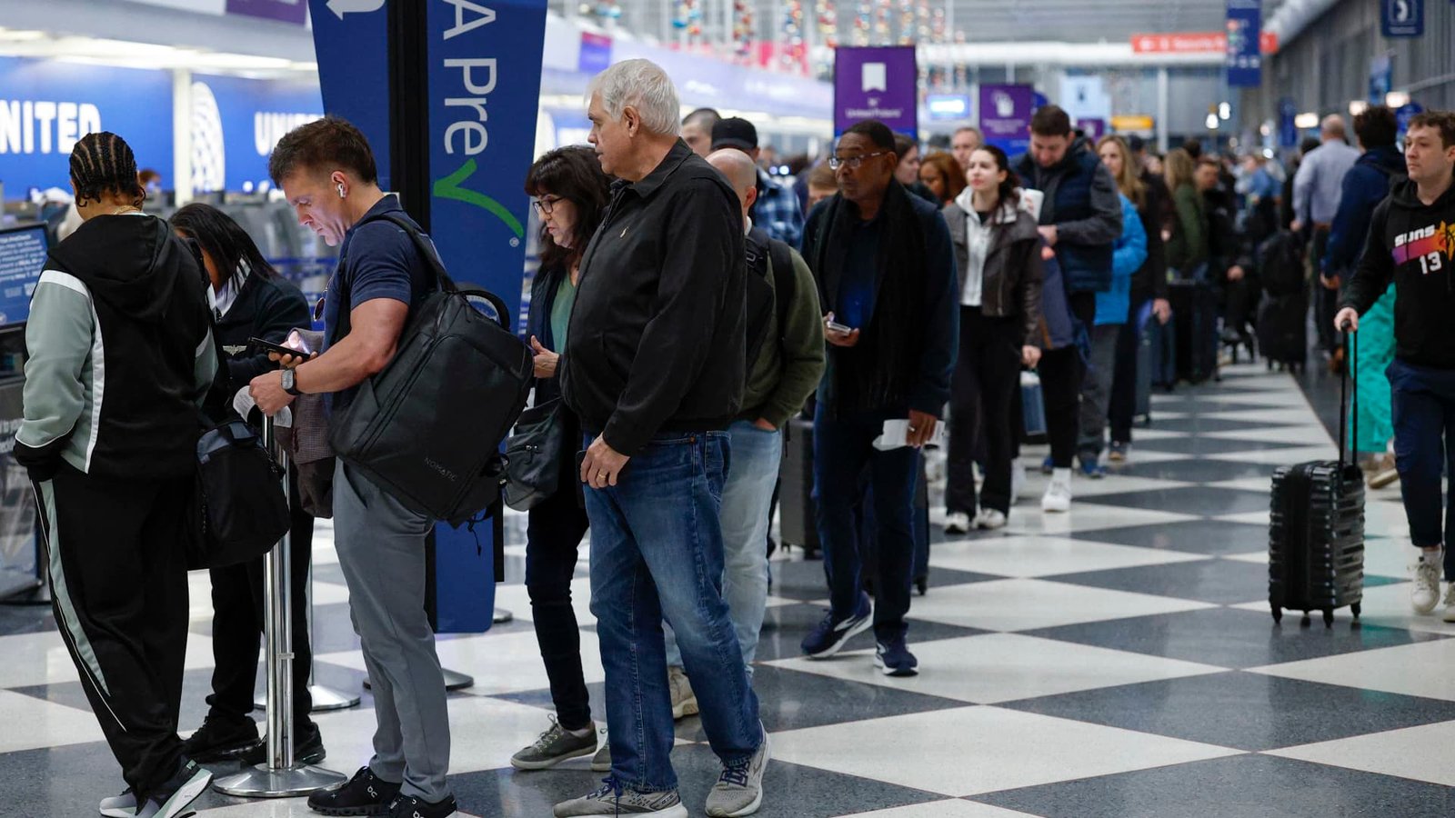 Travelers wait in line at a security checkpoint at O’Hare International Airport in Chicago, Illinois on November 7 2025.