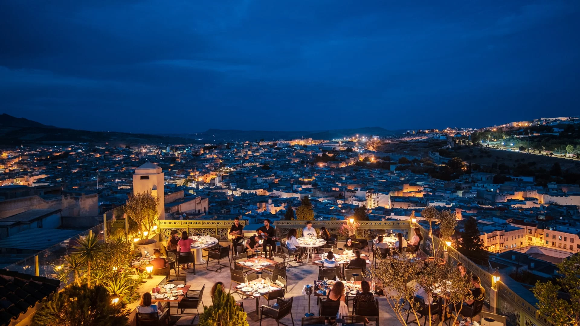 Riad Fes is a five-star Relais & Châteaux property located inside the Fez Medina, formed from several restored historic houses arranged around traditional courtyards. The on-site restaurant serves refined Moroccan cuisine in an elegant indoor dining space and in the central courtyard. The riad has a rooftop terrace with panoramic views over the Medina and surrounding hills. Alcohol is available, and the rooftop is often used for drinks at sunset and evening dining.